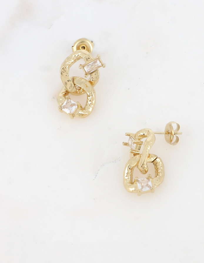 Boucles d'oreilles pendantes en acier inoxydable composées de deux anneaux losanges martelée et de cristaux rectangulaire et carré.